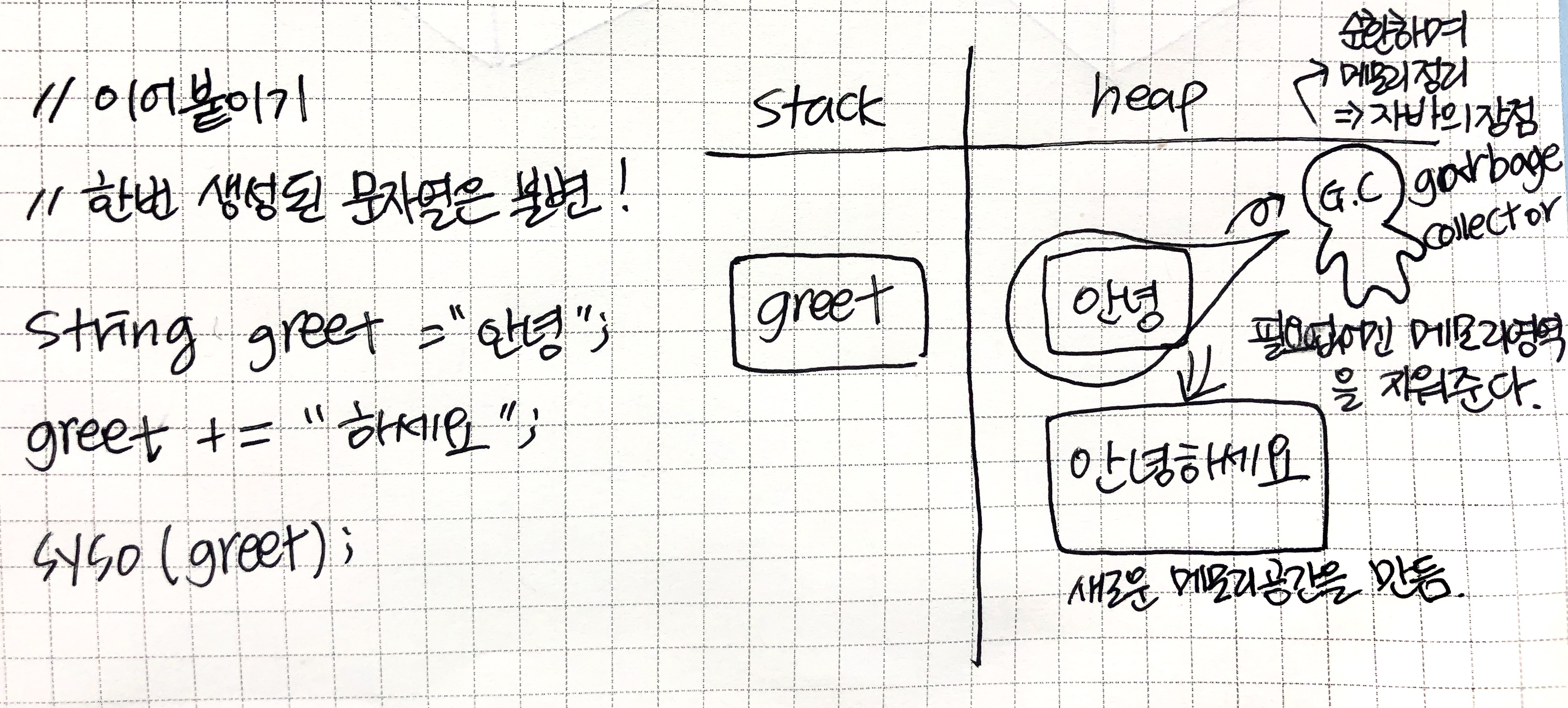 3. 한번 생성된 문자열의 내용은 변하지 않는다. (불변의 특징)