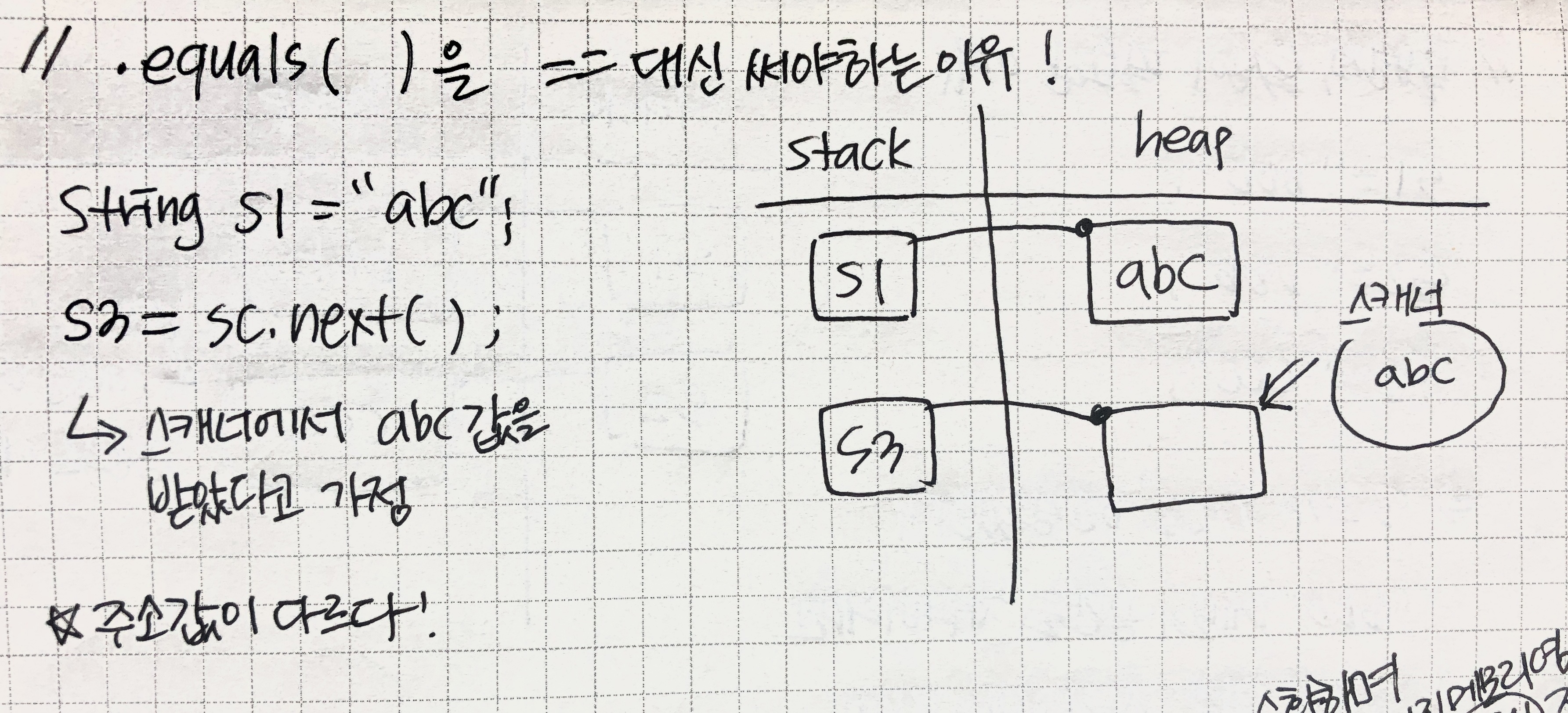 명시적으로 객체를 생성시 우리 눈에 값이 같아보여도 각각 다른 heap메모리에 저장되기때문에 주소값이 다르다!
